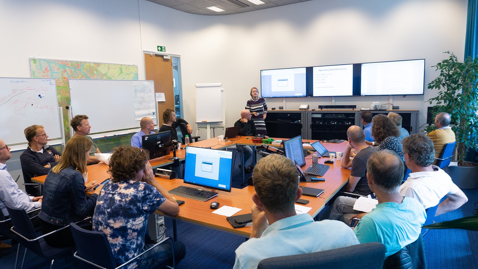 Na weer een warm en droog weekend is het regentekort in ons gebied nu 175 millimeter. Reden voor spoedoverleg. Medewerkers met verschillende expertises komen samen: de droogtecoördinator, communicatiespecialisten, een jurist en experts op het gebied van waterkwaliteit, dijken en zwemwater. Samen overleggen ze wat er moet gebeuren.