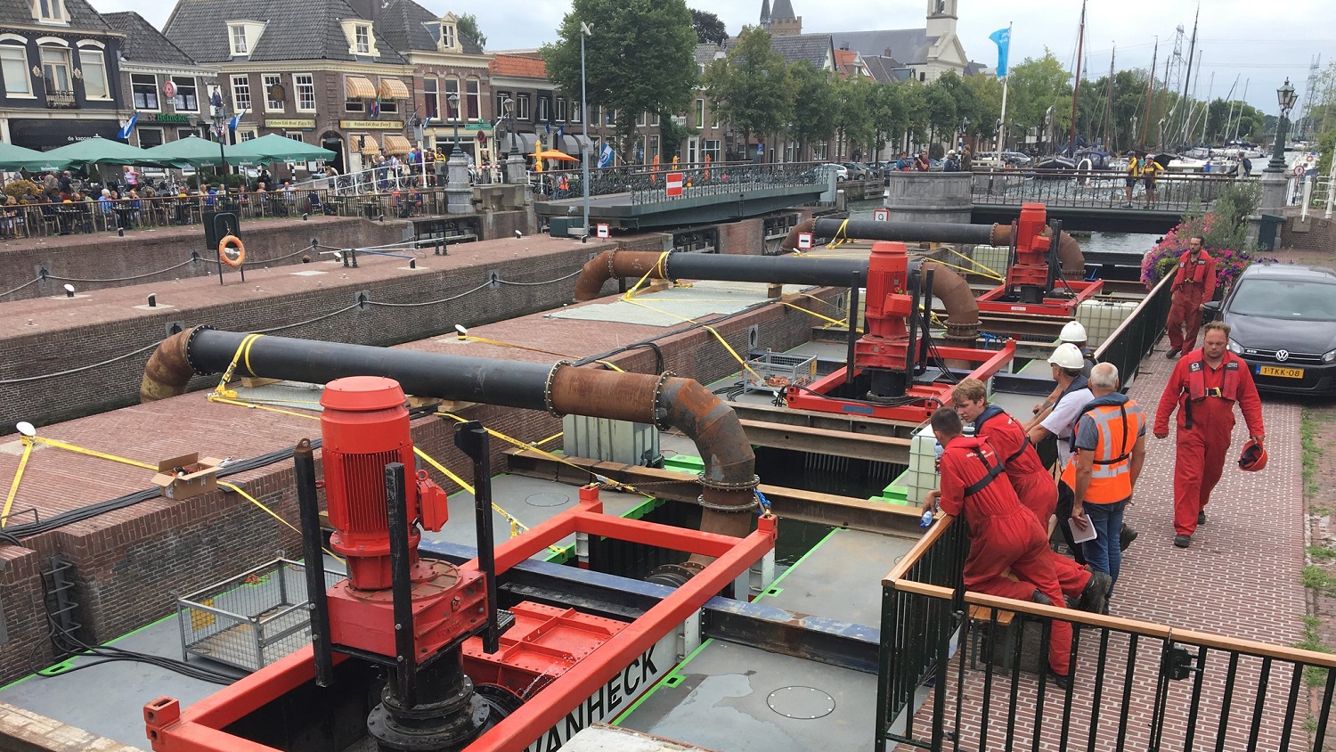 Het is de eerste keer dat we dit soort pompen op deze plek gebruiken. De sluis blijft open voor boten.